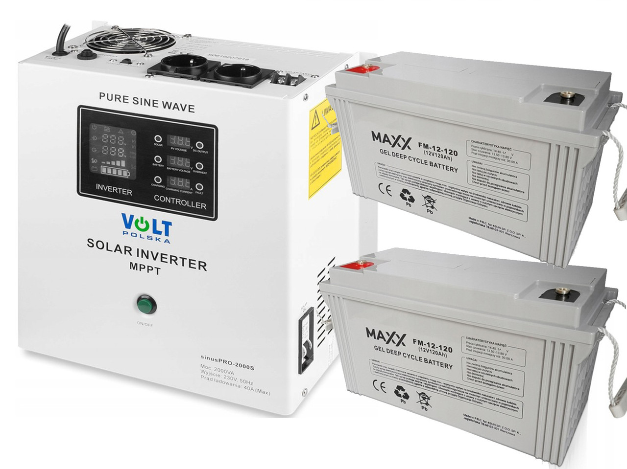 В комплекті Сонячний інвертор Sinus Pro 2000 S 24/230V (1400/2000W) + 2шт. Акумулятор Maxx 12-FM-120 120Ah 12V
